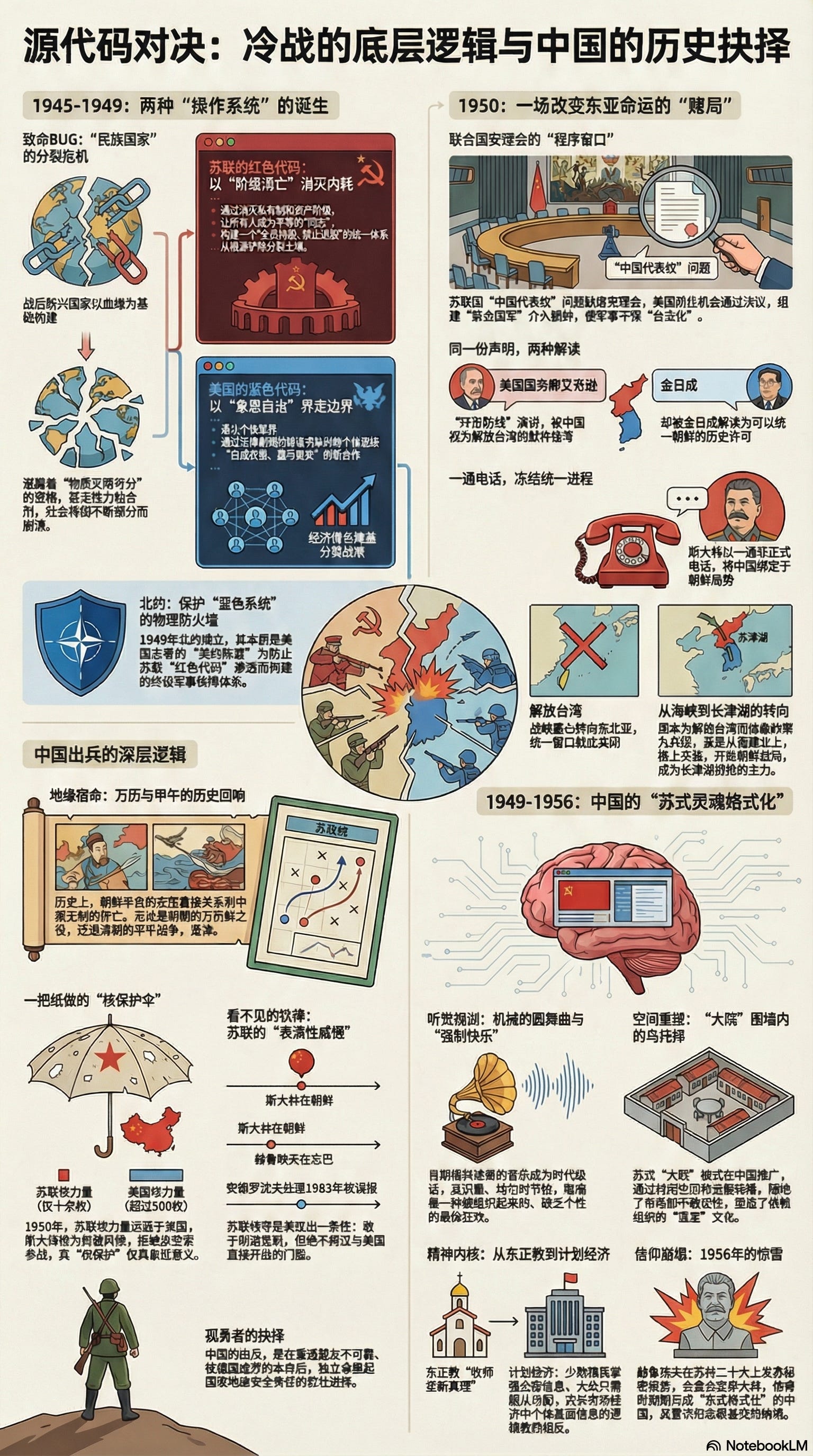 诸国皆为刑余之人,唯留一躯供驱使耳! 这幅《冷战六畜图》,就是 1950 年代世界格局的底层代码。 然而,历史的吊诡在于,手术也会有医疗事故。 斯大林万万没有想到,那头被他送上手术台、试图做成犍牛的中国,竟然在麻药还没醒的时候,在鸭绿江的冰雪中,向着持刀的村长狠狠地踢出了一脚。