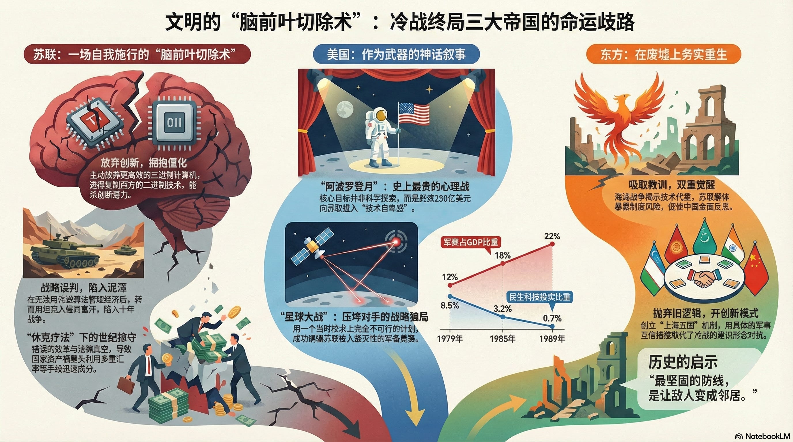 当苏联工程师拆解三进制计算机芯片制造导弹零件时,输掉的不仅是技术竞赛,更是对“叙事权”的掌控。里根总统那句“Fake it till you make it”的表演法则,成为这场战略欺诈的注脚——阿波罗用 250 亿美金买来的,不仅是 6 次登月,更是 20 年的战略心理优势,最终帮助美国不费一枪一弹赢得了冷战。