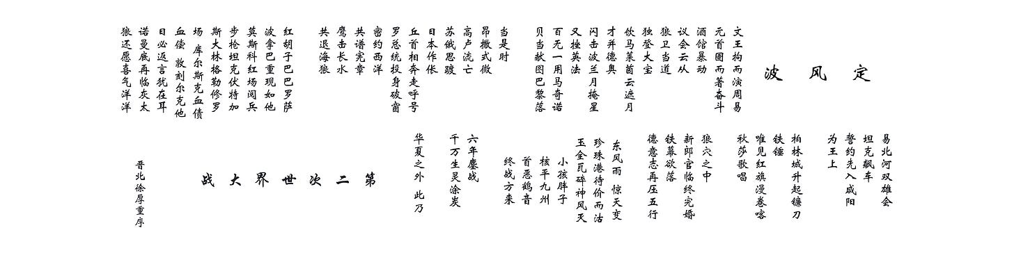 饮马莱茵云遮月,才并德奥;闪击波兰月掩星,又挫英法。 百无一用马奇诺,贝当献图巴黎落。 当是时,昂撒式微,高卢流亡,苏俄思踱,日本作伥。